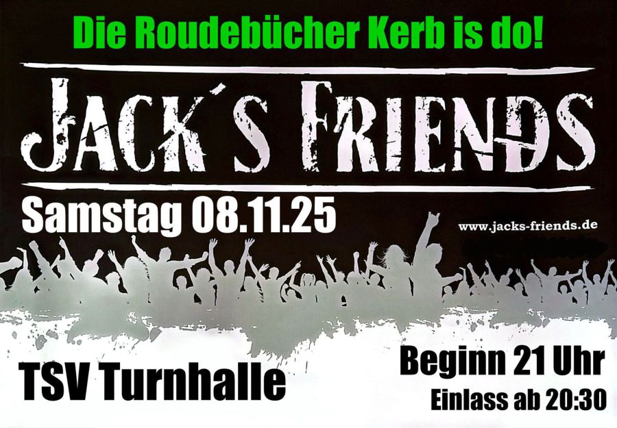 In diesem Jahr spielt am Kerbsamstag,dem 09.11.24 ab 21.00 Uhr wieder die Partyband "Jack`s Friends" in unserer TSV-Turnhalle.